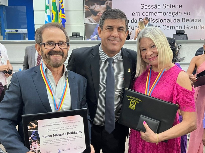 O vereador Beto Avelar fez a entrega da Comenda em alusão ao Dia Municipal do Profissional da Beleza criada para reconhecer o trabalho e o empenho de cabeleireiros, barbeiros, manicures e maquiadores de Campo Grande no trabalho em benefício da autoestima e bem estar da população. Beto Avelar fez a entrega da honraria para Itamar Marques Rodrigues e Katia Gonçalves Petruccio.