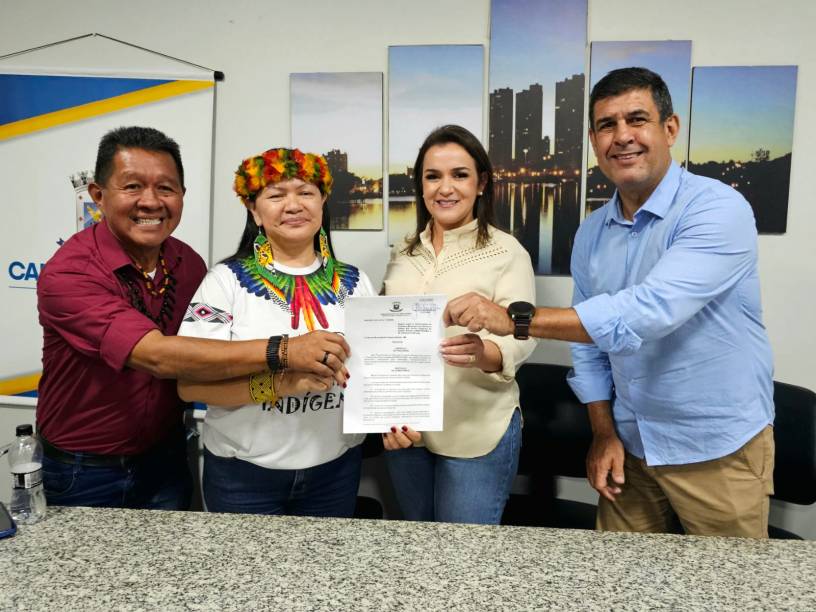 LEGENDA DA FOTO: Élcio Terena, da Subsecretaria Estadual de Políticas Públicas para os Povos Originários; a Rute Poquiviqui, presidente do Conselho Municipal de Defesa dos Direitos dos Povos Indígenas de Campo Grande; a prefeita Adriane Lopes e o vereador Beto Avelar.