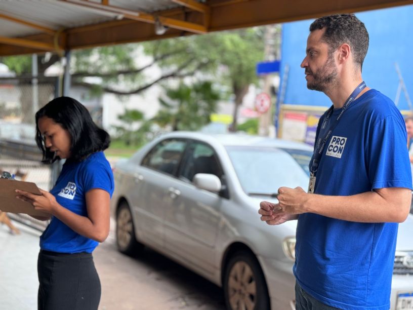#pratodosverem A imagem de capa mostra dois pesquisadores do Procon Municipal, um homem e uma mulher, em momento de coleta de dados em um estacionamento da cidade. Eles estão com pranchetas e uniformes de cor azul.