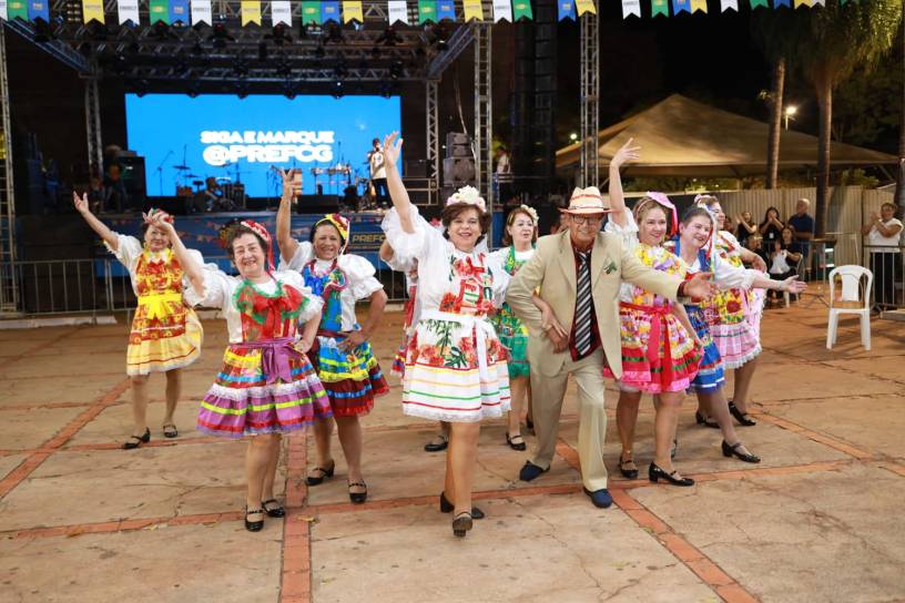 #pratodosverem Na matéria há dez fotos: a primeira mostra o grupo do Centro de Convivência do Idoso “Vovó Ziza” vestidos com trajes típicos de festa junina e saudando o público, durante a dança; a segunda mostra a professora de dança Priscila Veiga, responsável pela coreografia do grupo ACPMS; a terceira foto mostra a professora aposentada Tânia Ferracioli; a quarta imagem é da professora Aparecida de Souza; a quinta imagem é da quadrilha do Colégio Nova Geração, com roupas e sombrinha colorida, durante apresentação; a sexta foto mostra integrantes do Centro de Convivência do Idoso “Vovó Ziza” durante a quadrilha; a sétima imagem mostra Laura Camargo na companhia de uma adolescente com idade na faixa dos 13 anos; a oitava imagem é da Rose Duarte, acompanhada de uma menina com aproximadamente 9 anos de idade; a nona imagem mostra o cantor Max Henrique durante o show; a décima foto é da dupla Victor Gregório e Marco Aurélio, que fecharam o as atrações musicais do sábado (15).