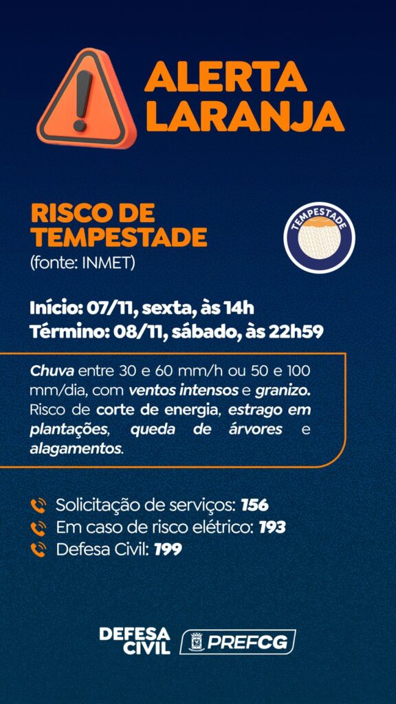 A Defesa Civil Municipal de Campo Grande informa que o Instituto Nacional de Meteorologia (INMET) emitiu Alerta Laranja para risco de tempestades na Capital. O aviso meteorológico é para risco de tempestade com início às 14h desta sexta-feira (07) até sábado (08), às 22h59.
